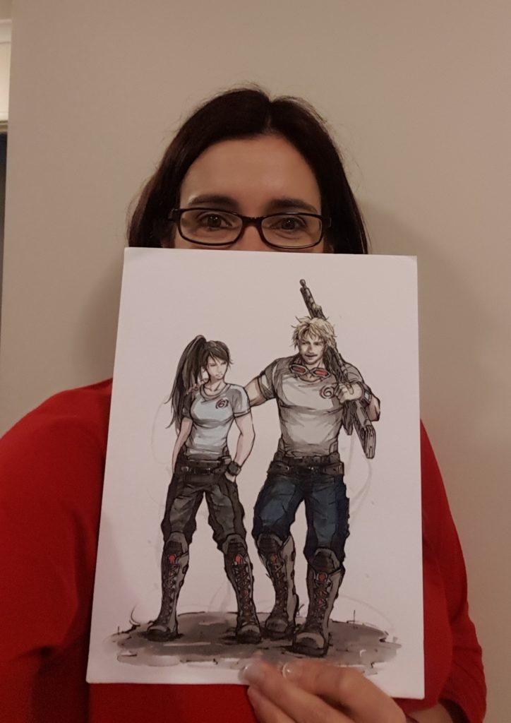 I am also SO THRILLED to be able to unveil a new piece of custom Hell Squad artwork by artist MyCKs. This art was commissioned by Hell Squad super fan Karen A. and features Hell Squad’s Claudia and Shaw. It is *so* great!